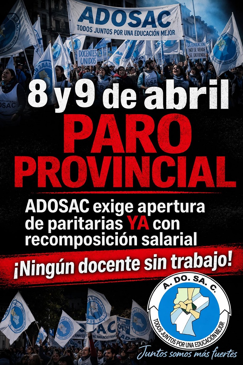La Asociación Docentes de Santa Cruz (ADOSAC) resolvió un paro de 48 horas en toda la provincia en reclamo de la apertura de paritarias con una recomposición salarial. La medida de fuerza está dispuesta para los días 8 y 9 de abril.
