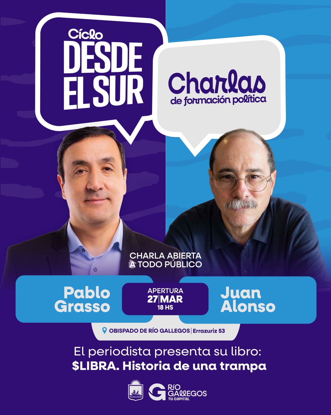 La Municipalidad de Río Gallegos invita a la comunidad a participar de una nueva edición del ciclo de charlas “Desde el Sur”, que contará con la presencia del periodista de investigación Juan Alonso, quien presentará “Libra, historia de una trampa”, sobre el caso que conmociona al país, sobre todo, tras la aparición de chats que probarían que el presidente Javier Milei y su hermana cobraron por la fenomenal criptoestafa internacional.